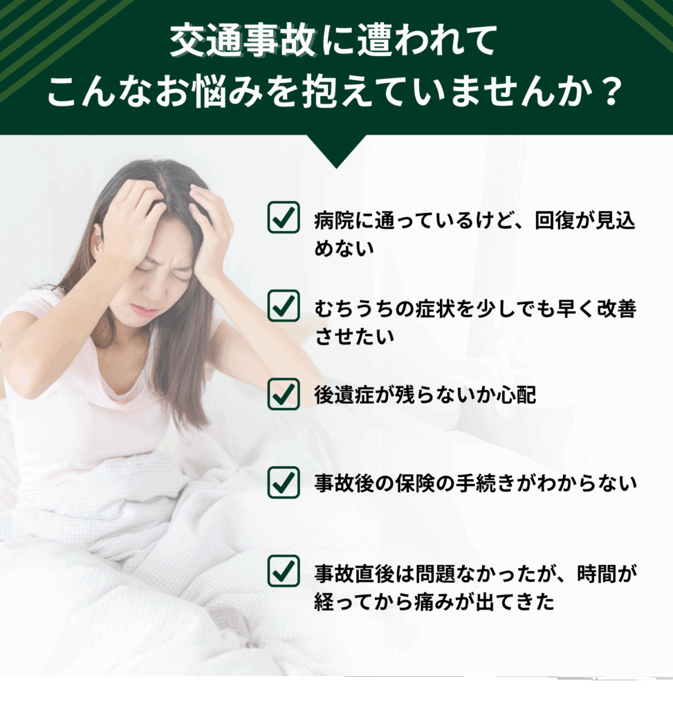 事故直後は軽い痛みだったとしても、放っておくと後遺症として痛みが残ったり、動かせる範囲が狭まったりすることがあります。痛みが少ないからと言って軽視せずに、早期に適切な処置を受ける必要があります。