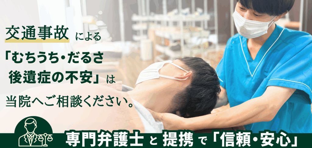 治療費負担、通院に関する慰謝料(自賠責基準は一通院あたり4,300円)などが対象となります。(当院の窓口負担は0円です)